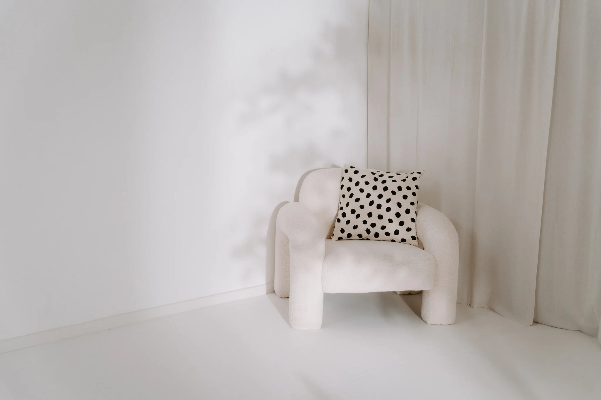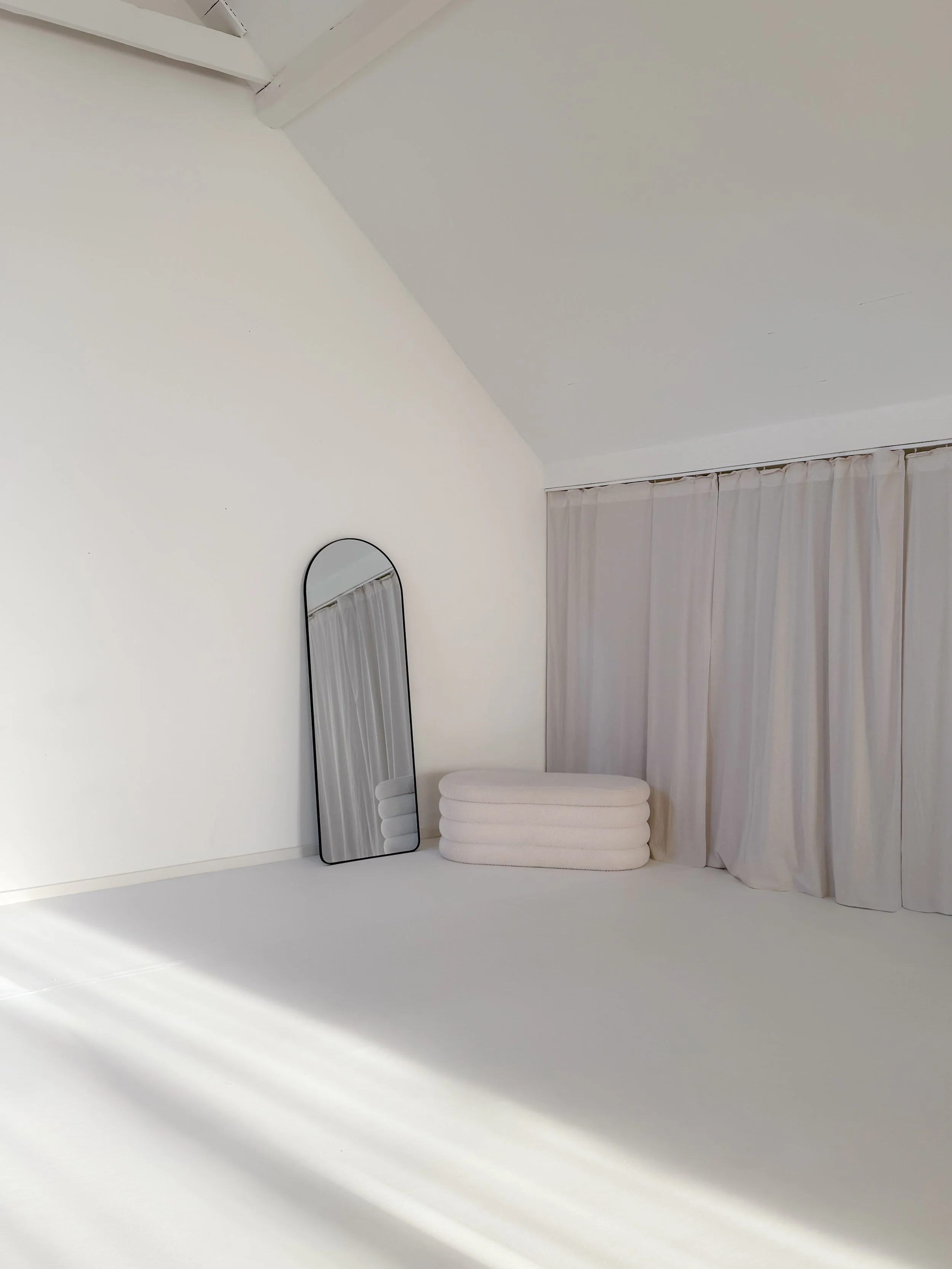 Ein lichtdurchflutetes, puristisch eingerichtetes Tageslichtstudio mit skandinavischem Flair und modernem Minimalismus. Der Raum besticht durch hohe weiße Deckenbalken, große Fenster und ein harmonisches Zusammenspiel aus hellem Holz und weißem Stoff.