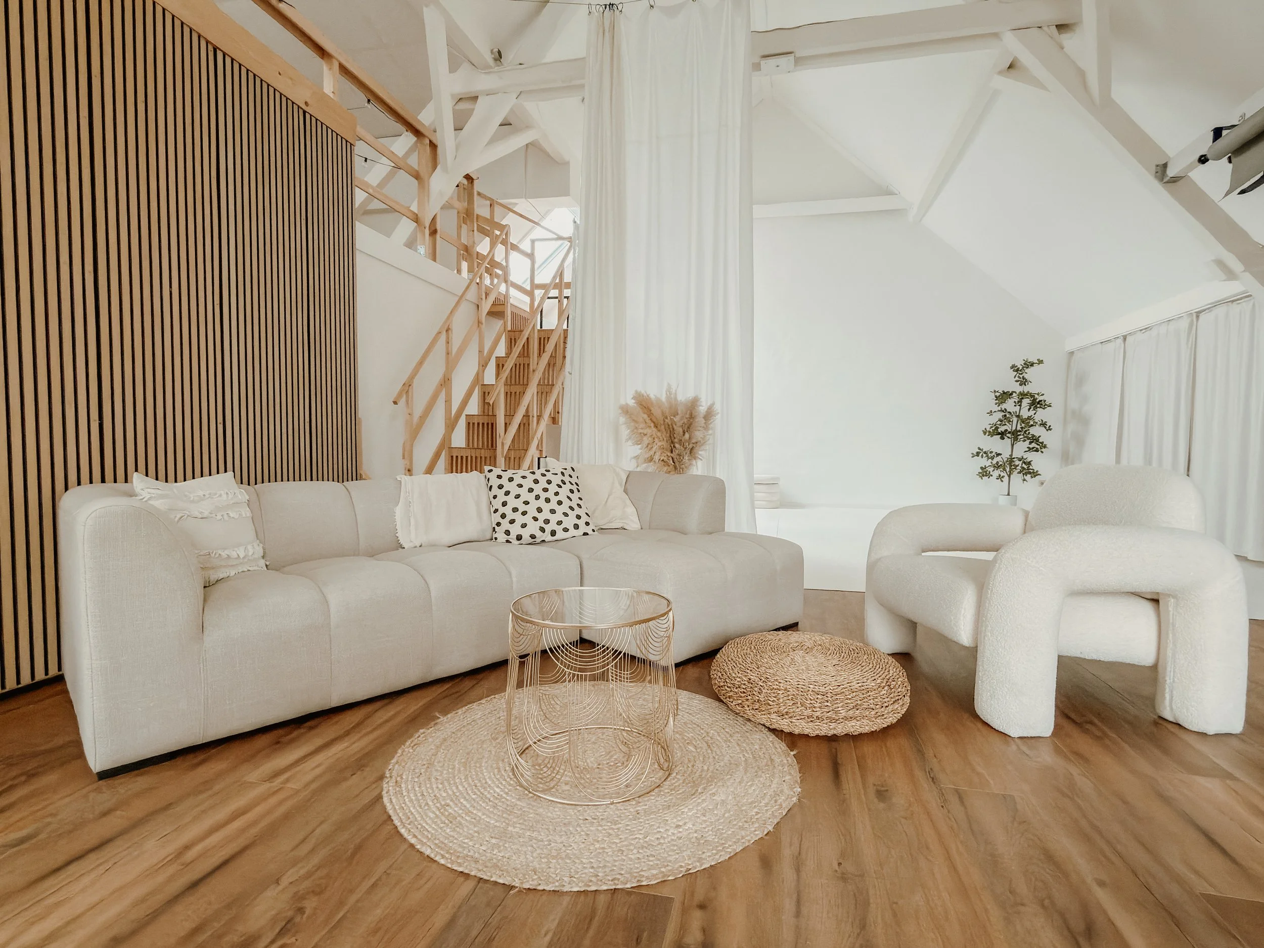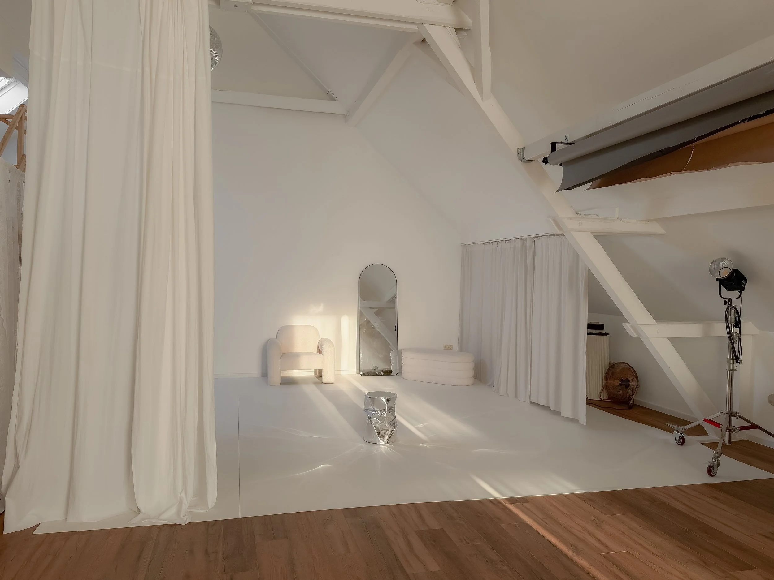 Der großzügige, offene Grundriss wird durch klare Linien, dezente Designelemente und warme Materialien geprägt. Weiße Vorhänge, Sessel, eine Empore und gezielte Akzente verleihen dem Studio eine ruhige, Atmosphäre, ideal für kreative, inspirierende oder bewusst entschleunigte Formate.