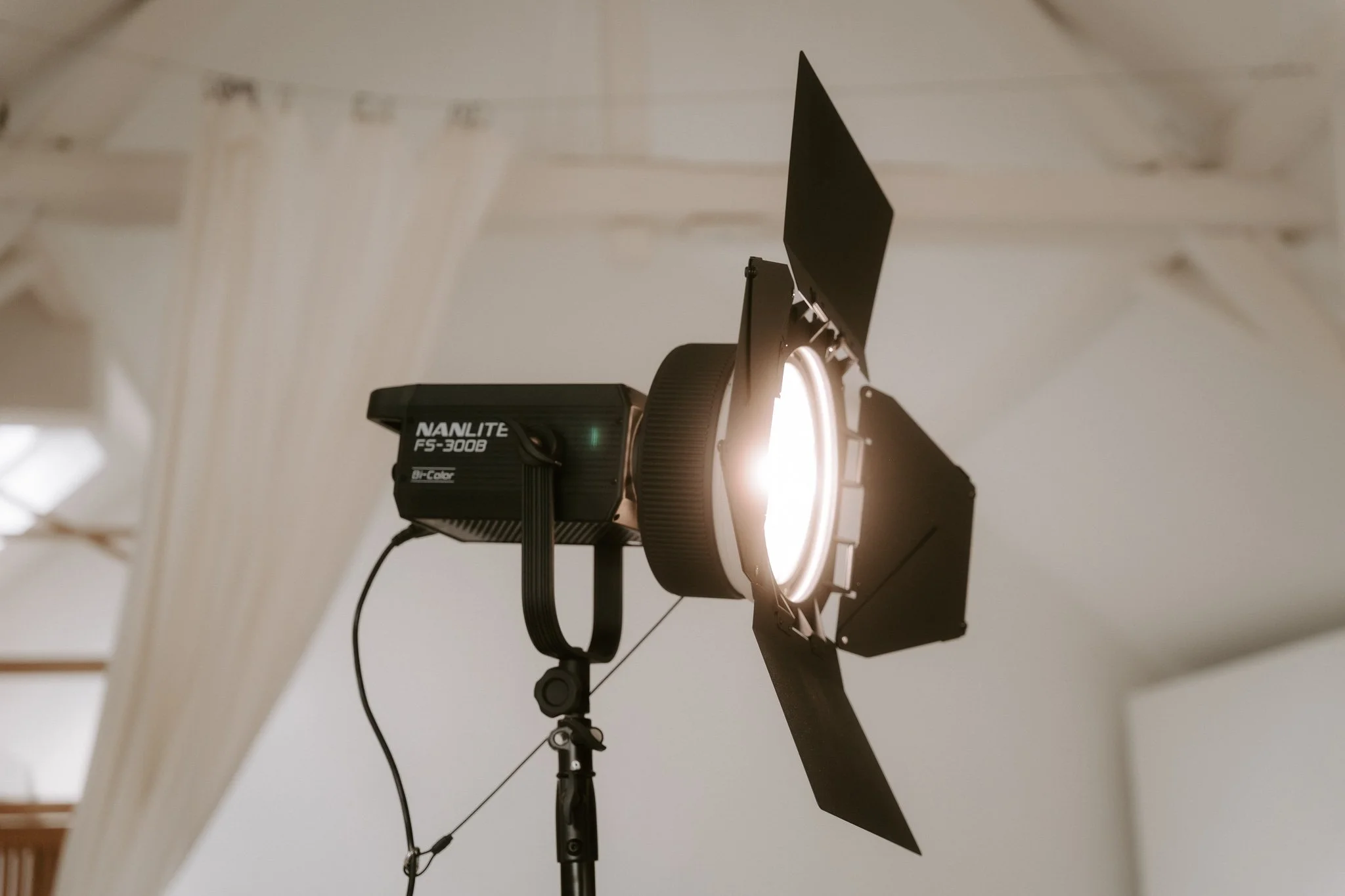 Auch an grauen Tagen kannst du hier wunderschöne Fotos machen, denn es gibt eine Nanlite Tageslichtlampe, farbvariabel und dimmbar mit einer Oktabox, einem Trichter und einer Fresnellinse. Die Lampe ist im Preis mit inbegriffen. Auch Sonne kann man damit faken, siehe Bild links.